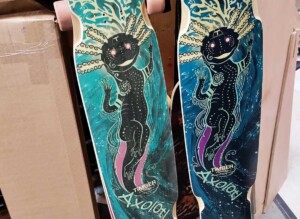 Links: het huidige skateboard. Rechts het verbeterde resultaat; geprint bamboehout afgewerkt met een matte epoxylaag.